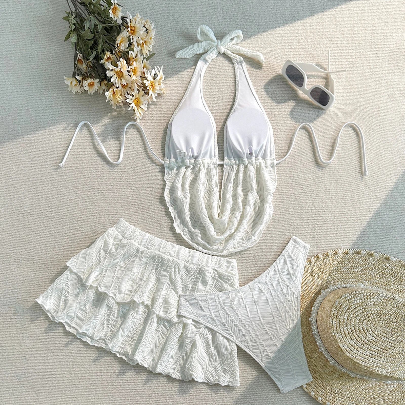 Maillot de bain tankini 3 pièces pour femme, ensemble comprenant un haut dos nu, un string et une jupe de bain à volants.